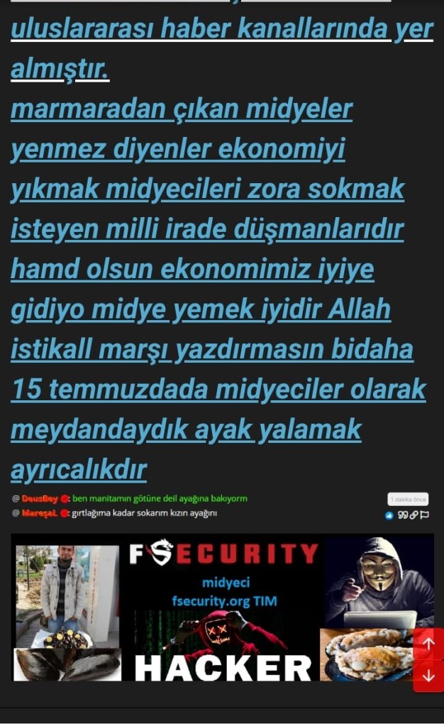 Midyeci Hacker olarak tanınan ve bu tip sözde hack forum sitelerinin bir kısmında üst düzey ekip üyesi olan şahıs 10 yaşında dahi çocukların olduğu bir ortamda, midye dolmaya sos olarak sperm dökmek, kaşık ile sprem yemek, ayak emmek hatta anal bölgeyi emmek gibi sapıkça ve zararlı şeyler anlatmaktan çekinmiyor.