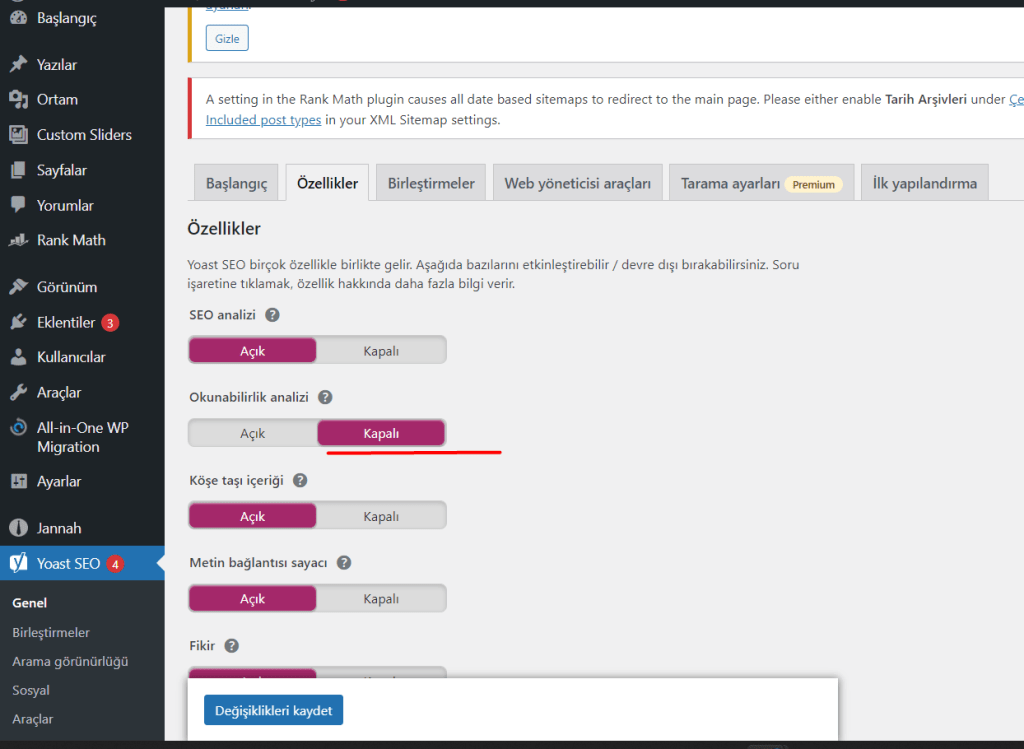 Örneğin, test sitemizde Yoast SEO’nun bazı uygulamalarla birlikte kullanıldığında hata vereceği uyarısı bulunmaktadır.