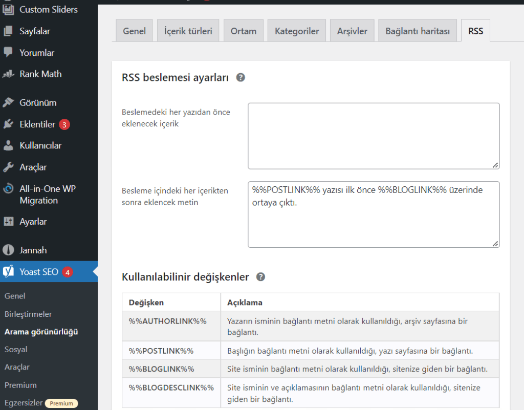 Son olarak RSS sekmesi, RSS beslemenize gönderi içeriğinizden önce veya sonra içerik eklemenizi sağlar. RSS yeni eklenen içeriğin kolaylıkla takip edilmesini sağlamaktadır.