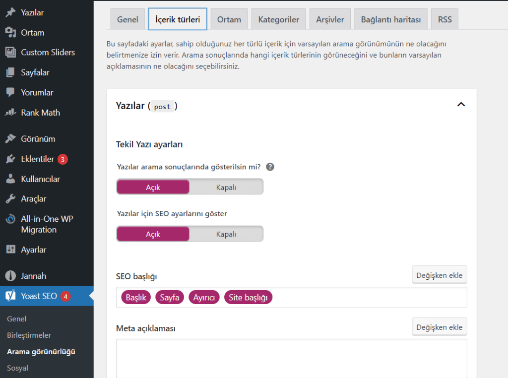 Arama motorlarının web sitenizi ve içeriğinizi anlamasına yardımcı olur. Yazı ve Sayfalar için bazı ayarlarınızı değiştirebilirsiniz.