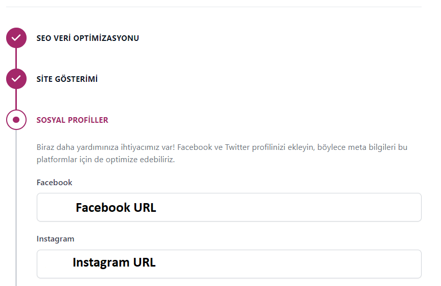 Bir kuruluş veya kişi için bir web sitesi oluşturulduğunda genellikle sosyal medya profilleride oluşturulmaktadır. Web sitenizin tüm sosyal medya profillerini ekleyebileceğiniz Yoast alanıdır.