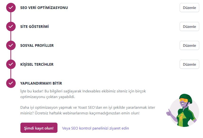 İlk kurulum aşamamız olan Yoast SEO Başlangıç Kılavuzunu tamamladık. Şimdi diğer başlığımız için devam ediyoruz.